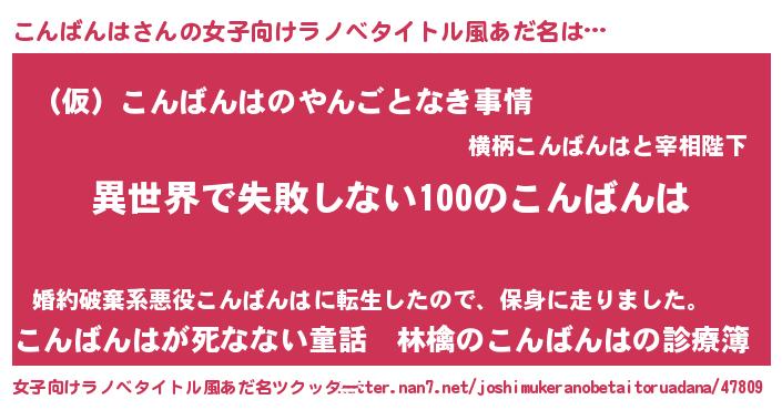 | 男性向けラノベタイトル風あだ名 | 『こんばんはという概念が存在しない退屈な世界 』 |