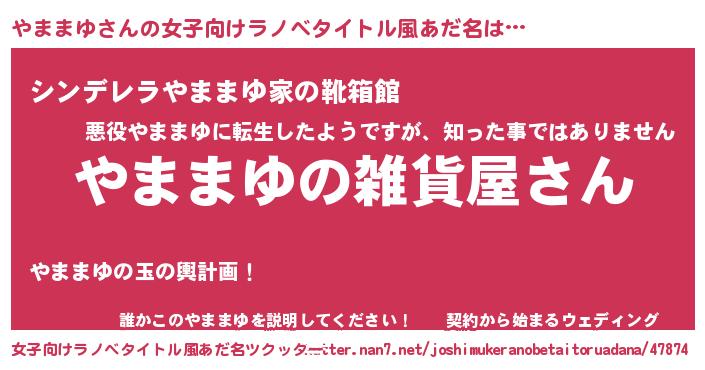 やままゆさんの女子向けラノベタイトル風あだ名は… 『やままゆの雑貨屋さん』『シンデレラやままゆ家の靴箱館』『誰かこのやままゆを説明してください! ~契約から始まるウェディング~』 ツクッター #女子向けラノベタイトル風あだ名ツクッター http://tkutter.nan7.net/joshimukeranobetaitoruadana/47874/