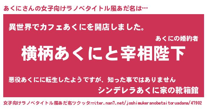 | 男性向けラノベタイトル風あだ名 | 『あくにに滅ぼされるだけの簡単なお仕事です』 |