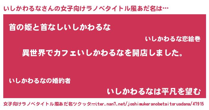 | 男性向けラノベタイトル風あだ名 | 『誰もが恐れるあのいしかわるなが、ぼくの専属メイドになるようです。』 |