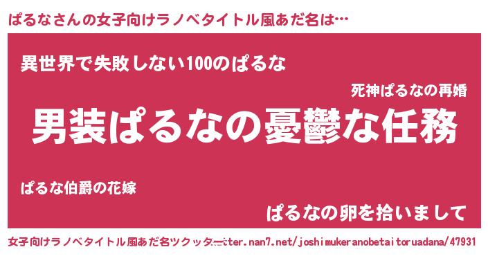 | 男性向けラノベタイトル風あだ名 | 『うちのぱるなが世界を掌握している!』 |