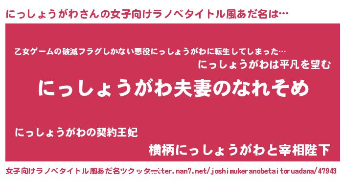 | 男性向けラノベタイトル風あだ名 | 『おまえをオタクにしてやるから、俺をにっしょうがわにしてくれ! 』 |