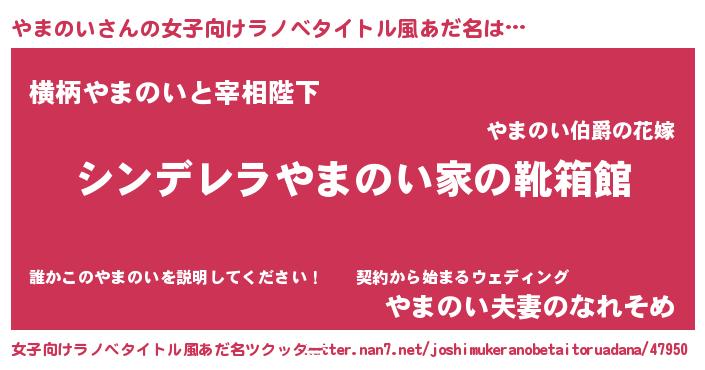やまのいさんの女子向けラノベタイトル風あだ名は… 『シンデレラやまのい家の靴箱館』『横柄やまのいと宰相陛下』『やまのい夫妻のなれそめ』 ツクッター #女子向けラノベタイトル風あだ名ツクッター http://tkutter.nan7.net/joshimukeranobetaitoruadana/47950/