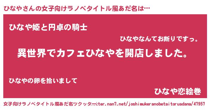 | 男性向けラノベタイトル風あだ名 | 『誰もが恐れるあのひなやが、ぼくの専属メイドになるようです。』 |