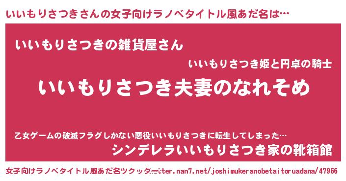 いいもりさつきさんの女子向けラノベタイトル風あだ名は… 『いいもりさつき夫妻のなれそめ』『いいもりさつきの雑貨屋さん』『シンデレラいいもりさつき家の靴箱館』 ツクッター #女子向けラノベタイトル風あだ名ツクッター http://tkutter.nan7.net/joshimukeranobetaitoruadana/47966/