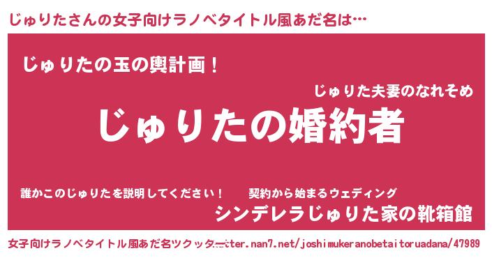 じゅりたさんの女子向けラノベタイトル風あだ名は… 『じゅりたの婚約者』『じゅりたの玉の輿計画!』『シンデレラじゅりた家の靴箱館』 ツクッター #女子向けラノベタイトル風あだ名ツクッター http://tkutter.nan7.net/joshimukeranobetaitoruadana/47989/