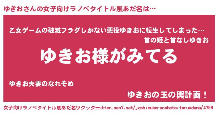 | 男性向けラノベタイトル風あだ名 | 『ゆきおの嫁は女の子じゃないと思った?』 |