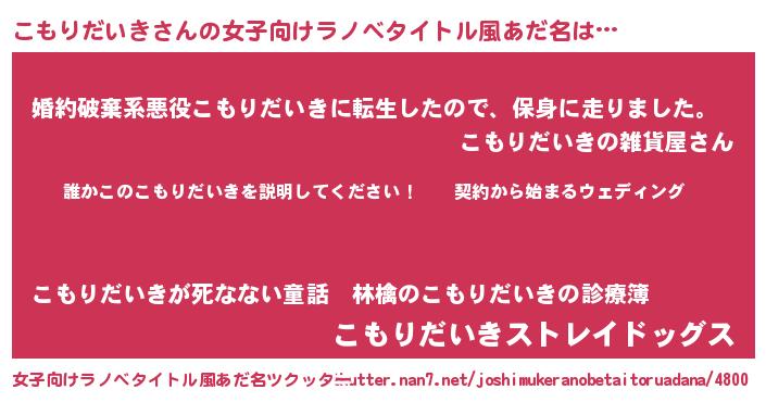 男性向けラノベタイトル風あだ名 | 『コモリダイキアートオンライン』 |
