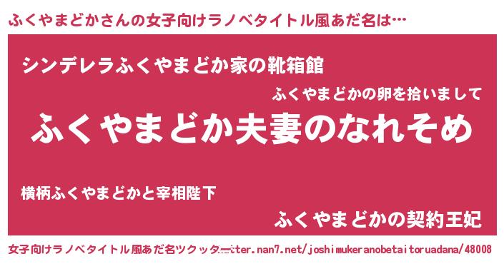 | 男性向けラノベタイトル風あだ名 | 『おまえをオタクにしてやるから、俺をふくやまどかにしてくれ! 』 |