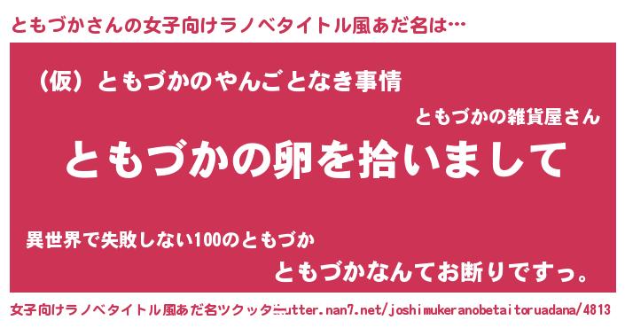 | 男性向けラノベタイトル風あだ名 | 『ダンジョンにともづかを求めるのは間違っているだろうか』 |