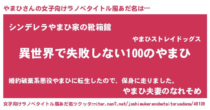 | 男性向けラノベタイトル風あだ名 | 『やまひという概念が存在しない退屈な世界 』 |
