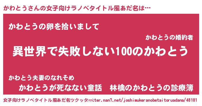 | 男性向けラノベタイトル風あだ名 | 『かわとうという概念が存在しない退屈な世界 』 |