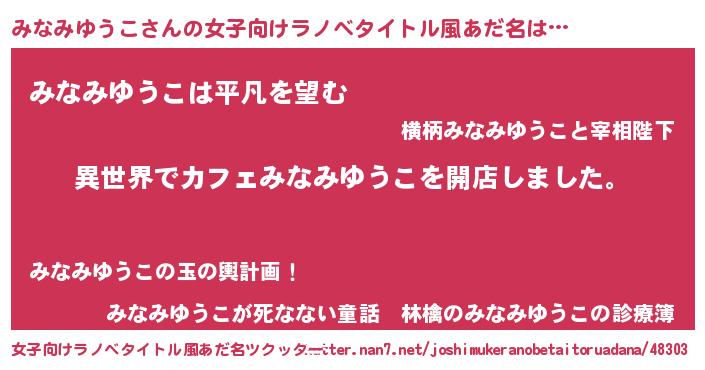 | 男性向けラノベタイトル風あだ名 | 『誰もが恐れるあのみなみゆうこが、ぼくの専属メイドになるようです。』 |