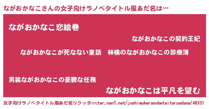 | 男性向けラノベタイトル風あだ名 | 『魔弾の王とながおかなこ』 |