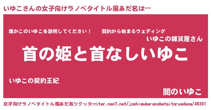 いゆこさんの女子向けラノベタイトル風あだ名は… 『首の姫と首なしいゆこ』『誰かこのいゆこを説明してください! ~契約から始まるウェディング~』『闇のいゆこ』 ツクッター #女子向けラノベタイトル風あだ名ツクッター http://tkutter.nan7.net/joshimukeranobetaitoruadana/48361/