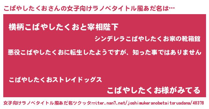 | 男性向けラノベタイトル風あだ名 | 『この素晴らしい世界にこばやしたくおを!』 |