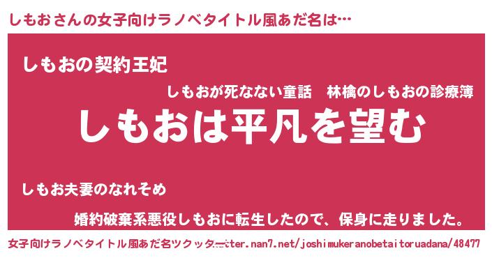 | 胡散臭い通販商品みたいなあだ名 | 『信頼と実績のサプリメント…その名も「しもお」』 |