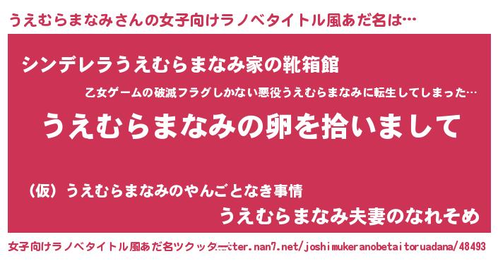 うえむらまなみさんの女子向けラノベタイトル風あだ名は… 『うえむらまなみの卵を拾いまして』『シンデレラうえむらまなみ家の靴箱館』『うえむらまなみ夫妻のなれそめ』 ツクッター #女子向けラノベタイトル風あだ名ツクッター http://tkutter.nan7.net/joshimukeranobetaitoruadana/48493/