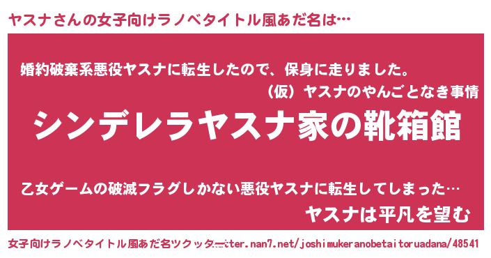 | 胡散臭い通販商品みたいなあだ名 | 『信頼と実績のネックレス…その名も「ヤスナ」』 |