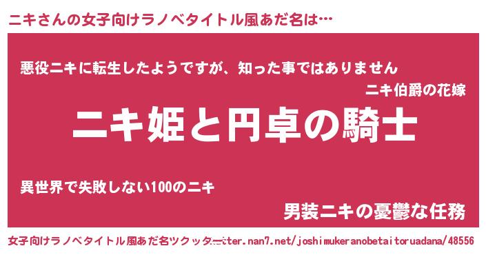 | 男性向けラノベタイトル風あだ名 | 『ニキの憂鬱』『冴えないニキの育てかた』 |