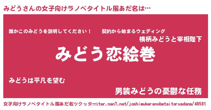| 男性向けラノベタイトル風あだ名 | 『おまえをオタクにしてやるから、俺をみどうにしてくれ! 』 |