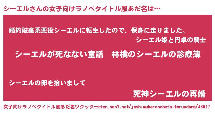 | 男性向けラノベタイトル風あだ名 | 『魔弾の王とシーエル』 |