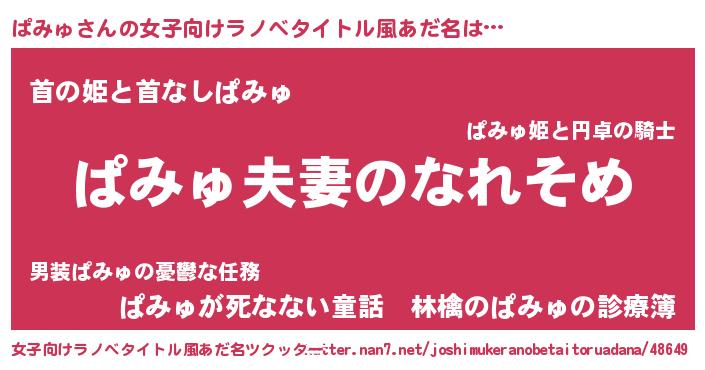 | 男性向けラノベタイトル風あだ名 | 『おまえをオタクにしてやるから、俺をぱみゅにしてくれ! 』 |