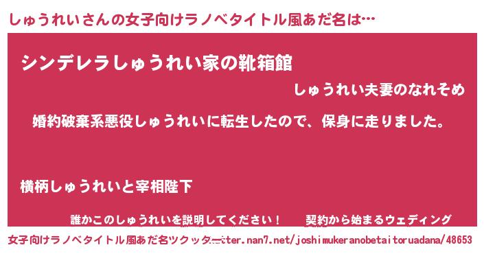 | 男性向けラノベタイトル風あだ名 | 『シュウレイスレイヤー』 |