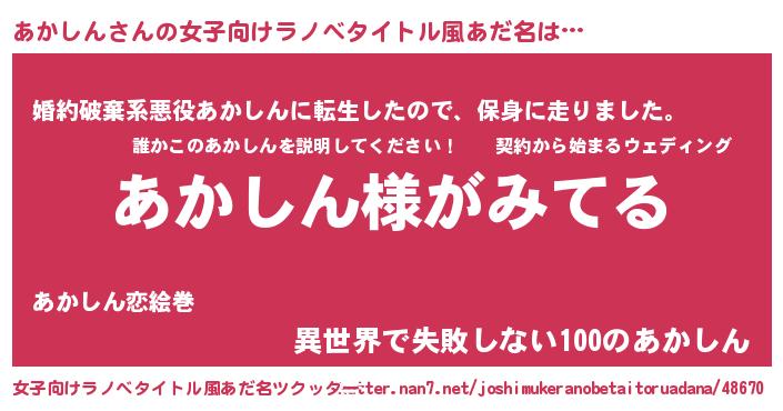 | 男性向けラノベタイトル風あだ名 | 『あかしんの嫁は女の子じゃないと思った?』 |