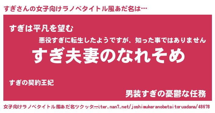 | 男性向けラノベタイトル風あだ名 | 『おまえをオタクにしてやるから、俺をすぎにしてくれ! 』 |