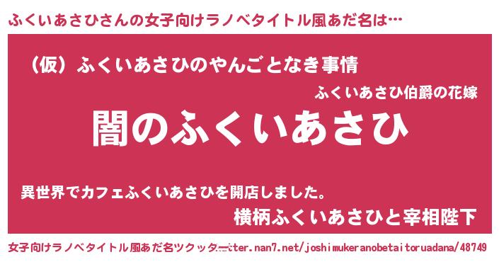 | 男性向けラノベタイトル風あだ名 | 『Re:ふくいあさひから始める異世界生活』 |
