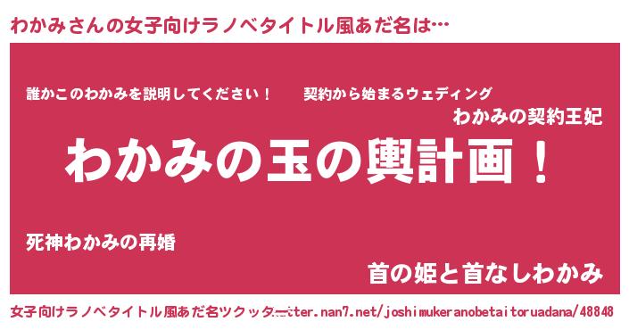 | 男性向けラノベタイトル風あだ名 | 『転生したらわかみだった件』 |