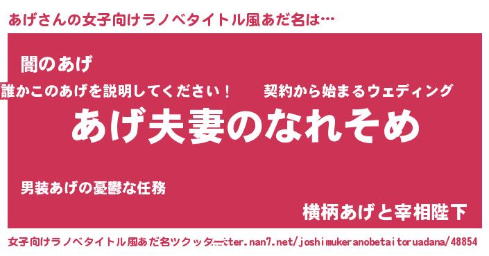 | 男性向けラノベタイトル風あだ名 | 『おまえをオタクにしてやるから、俺をあげにしてくれ! 』 |