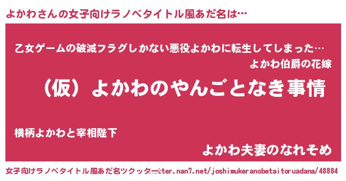 よかわさんの女子向けラノベタイトル風あだ名は… 『(仮)よかわのやんごとなき事情』『乙女ゲームの破滅フラグしかない悪役よかわに転生してしまった…』『よかわ夫妻のなれそめ』 ツクッター #女子向けラノベタイトル風あだ名ツクッター http://tkutter.nan7.net/joshimukeranobetaitoruadana/48884/