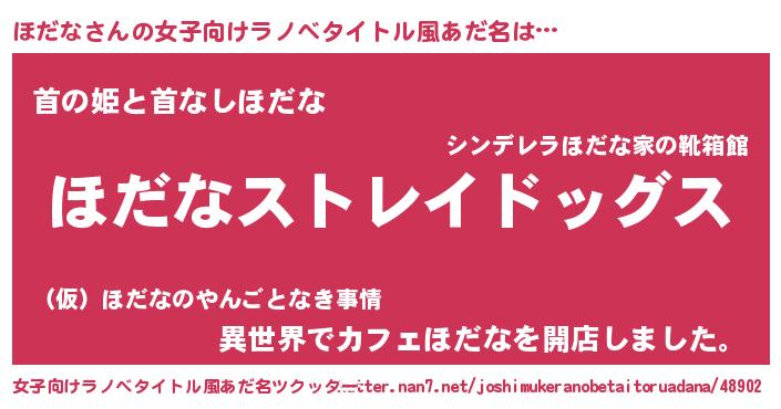 | 男性向けラノベタイトル風あだ名 | 『Re:ほだなから始める異世界生活』 |