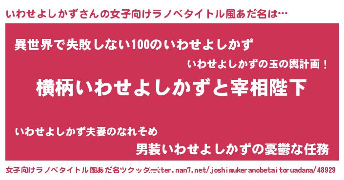 | 男性向けラノベタイトル風あだ名 | 『いわせよしかずに滅ぼされるだけの簡単なお仕事です』 |
