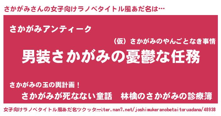 | 男性向けラノベタイトル風あだ名 | 『うちのさかがみが世界を掌握している!』 |