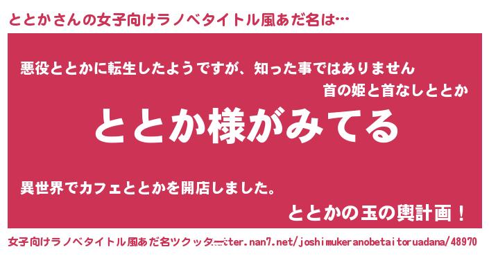 | 男性向けラノベタイトル風あだ名 | 『ととかの嫁は女の子じゃないと思った?』 |
