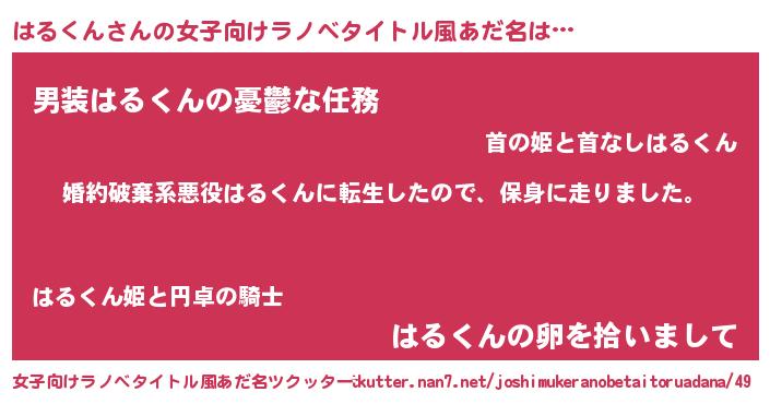 | 男性向けラノベタイトル風あだ名 | 『ハルクンスレイヤー』『はるくんの憂鬱』 |
