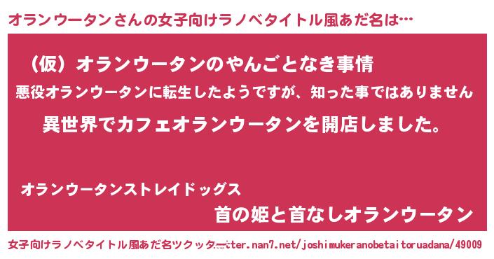| 料理風あだ名 | 『簡単☆あっさり美味しいとろける塩オランウータン肉じゃが』 |