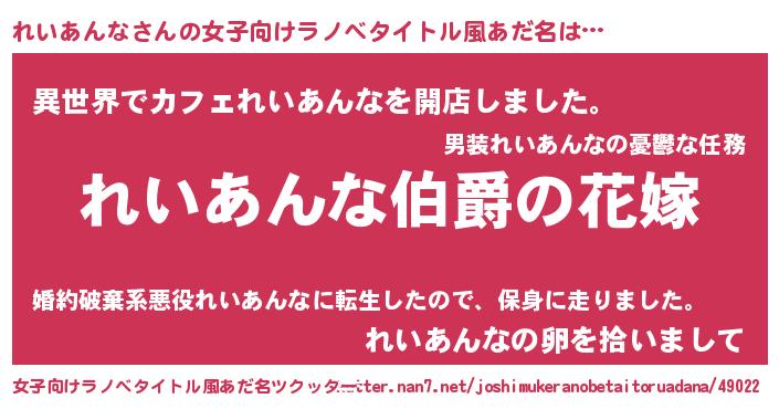 れいあんなさんの女子向けラノベタイトル風あだ名は… 『れいあんな伯爵の花嫁』『異世界でカフェれいあんなを開店しました。』『れいあんなの卵を拾いまして』 ツクッター #女子向けラノベタイトル風あだ名ツクッター http://tkutter.nan7.net/joshimukeranobetaitoruadana/49022/