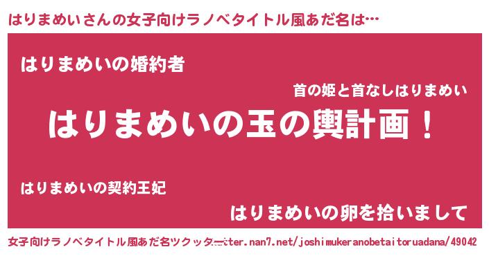 | 男性向けラノベタイトル風あだ名 | 『転生したらはりまめいだった件』 |