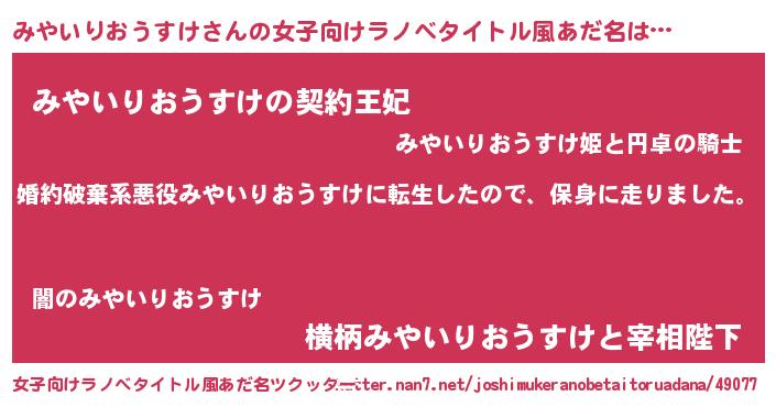 | 男性向けラノベタイトル風あだ名 | 『ミヤイリオウスケスレイヤー』 |
