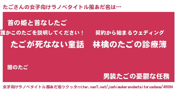 | 男性向けラノベタイトル風あだ名 | 『魔弾の王とたご』『はたらくたごさま!』 |