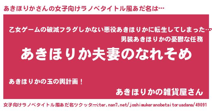 | 男性向けラノベタイトル風あだ名 | 『おまえをオタクにしてやるから、俺をあきほりかにしてくれ! 』 |