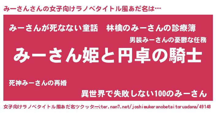| 男性向けラノベタイトル風あだ名 | 『ミーサンアートオンライン』 |