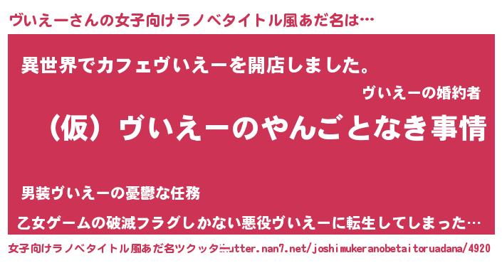 | 男性向けラノベタイトル風あだ名 | 『ヴいえーの憂鬱』 |