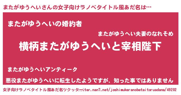 | 男性向けラノベタイトル風あだ名 | 『またがゆうへいに滅ぼされるだけの簡単なお仕事です』 |