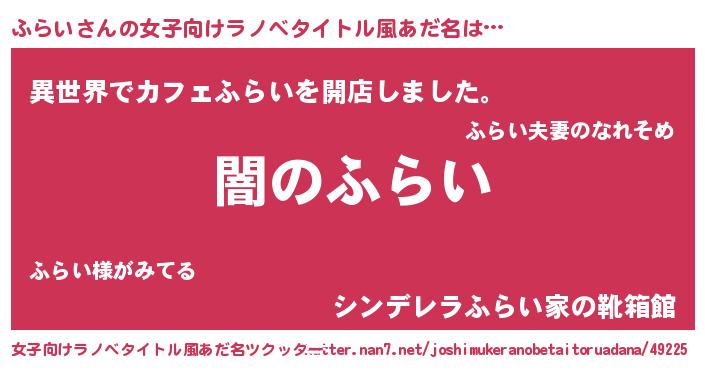 | 男性向けラノベタイトル風あだ名 | 『Re:ふらいから始める異世界生活』 |