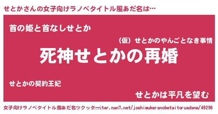 | ヒーロー風カッコイイあだ名 | 『慈愛の使者せとか』『魔戒騎士セト』 |